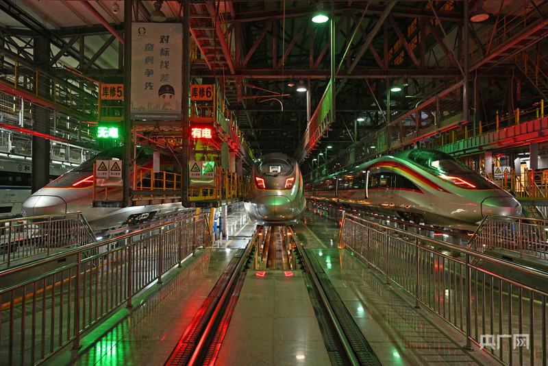 检修库内复兴号智能动车组停放整齐(央广网发 马桂福 摄)